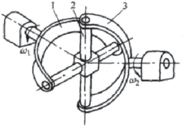 十字軸萬向聯(lián)軸器的結(jié)構(gòu)原理如圖2所示,主動(dòng)軸、從動(dòng)軸上的萬向節(jié)叉1、3中間的十字軸2分別以鉸鏈連接,當(dāng)兩軸有角位移時(shí),萬向節(jié)叉1、3繞各自軸線回轉(zhuǎn),而十字軸則做空間運(yùn)動(dòng)。