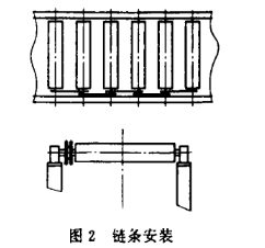 通過上述分析,在方案設想中,將直形輥道和弧形輥道都設計成動力式。在動力式滾筒輸送機中,一般采用鏈條、傘齒輪和膠帶驅動輥子。根據此輸送機的特點以及車輪的重量,采用鏈條作為驅動輥子的動力鏈條的安裝方法如圖2所示,即依次裝在一對輥子上,其優點是傳動平穩可靠噪音比較小,且可滿足弧形輥道的要求。